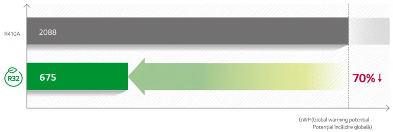 R32 functioneaza eficient in volume reduse in comparatie cu agentul frigorific R410, care reduce riscul incalzirii globale. Mai mult, refrigerantul R32 este usor de reciclat datorita compozitiei sale.
